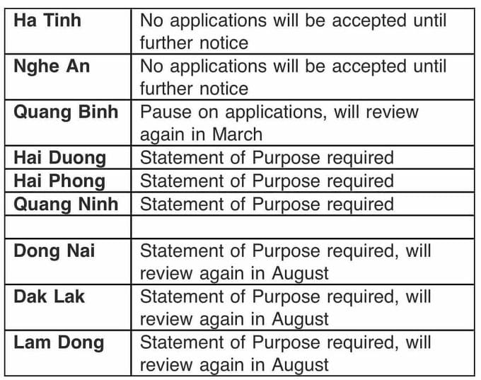 Cụ thể, Sở Giáo dục của bang tạm thời không chấp nhận đơn nhập học từ học sinh đến từ Nghệ An và Hà Tĩnh, cho đến khi có thông báo mới. Đối với học sinh từ tỉnh Quảng Bình, việc dừng việc nhập học cũng được áp dụng, nhưng sẽ được xem xét lại vào tháng 3.