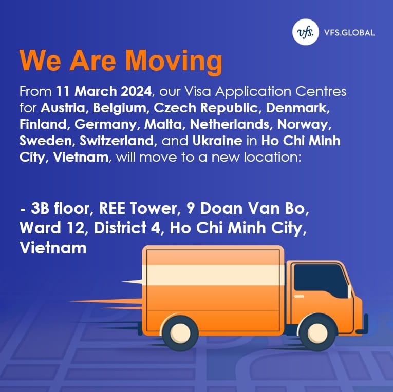 Từ ngày 11 tháng 3 năm 2024, Trung tâm tiếp nhận thị thực Đức, Áo, Bỉ, Cộng Hòa Séc, Đan Mạch, Phần Lan, Hà Lan, Na Uy, Malta, Thụy Sĩ, Thụy Điển và Ukraina tại Thành phố Hồ Chí Minh, Việt Nam sẽ chuyển đến địa điểm mới.
