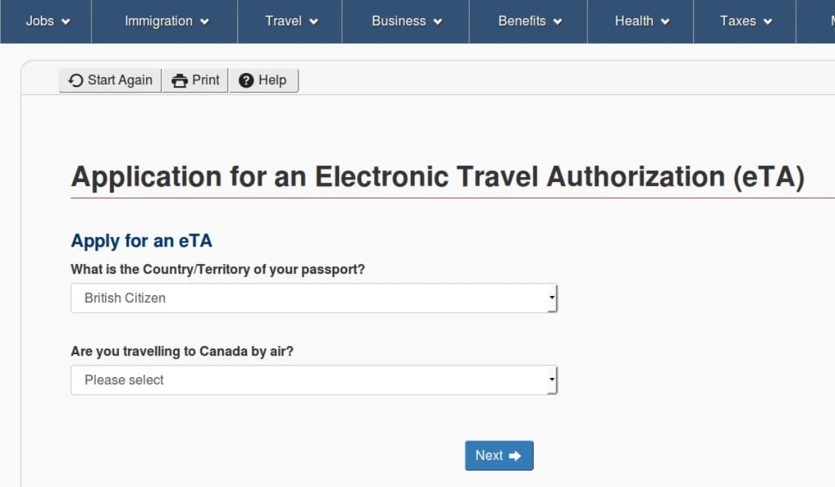 - Chọn “Apply for an eTA” (bắt đầu đăng ký).