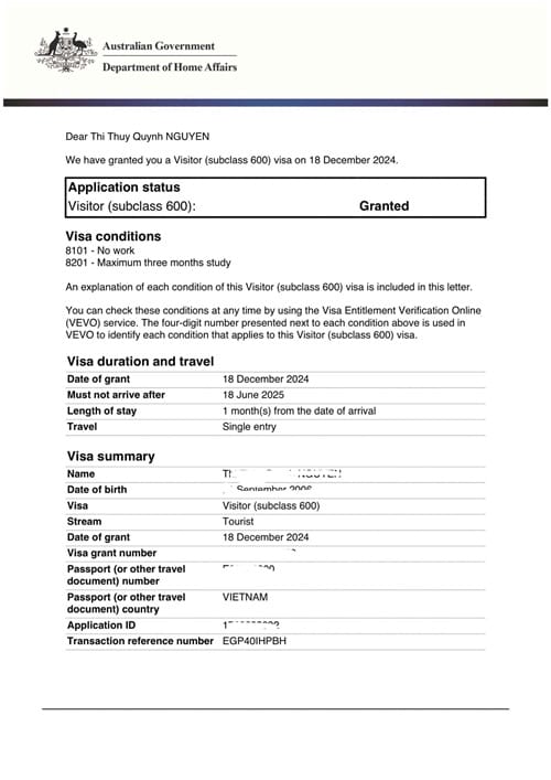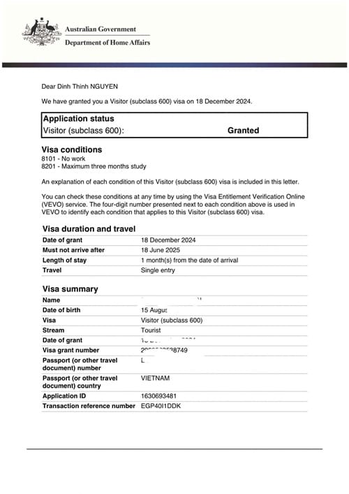Sau khi hoàn tất toàn bộ thủ tục, bạn có thể theo dõi tình trạng xét duyệt visa qua tài khoản ImmiAccount và chờ thông báo kết quả. Visa sẽ được cấp dưới dạng điện tử qua email (file PDF), bạn chỉ cần in ra mang theo khi nhập cảnh. Tuyệt đối không nên đặt vé máy bay trước khi được cấp visa và không đến Úc nếu chưa nhận được visa chính thức. Việc chuẩn bị kỹ lưỡng hồ sơ và tuân thủ quy trình sẽ giúp bạn tăng khả năng được cấp visa, rút ngắn thời gian xử lý và đảm bảo quá trình nộp hồ sơ diễn ra thuận lợi.